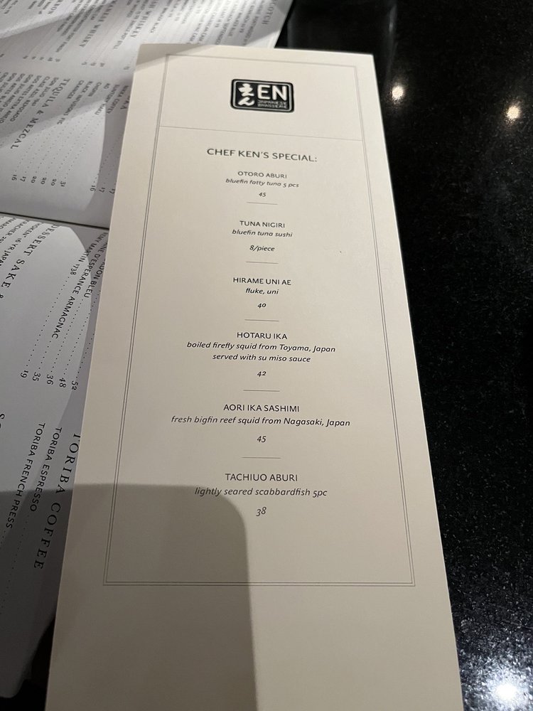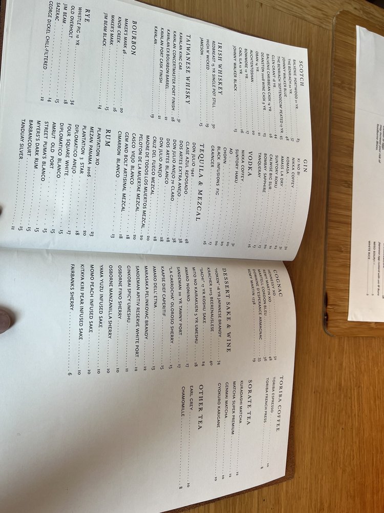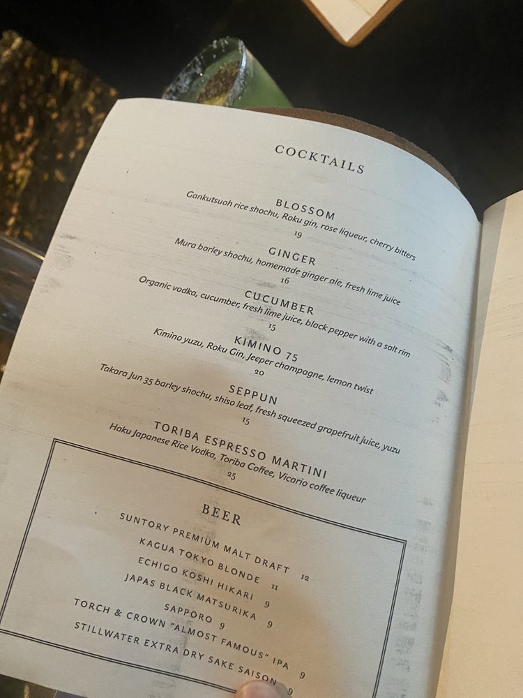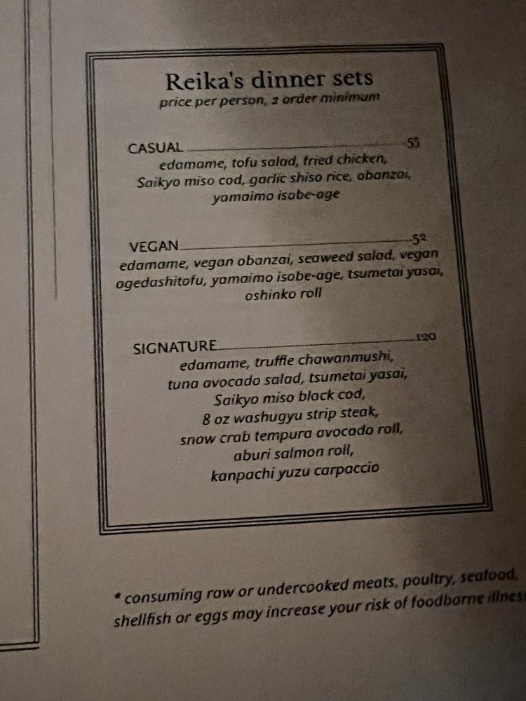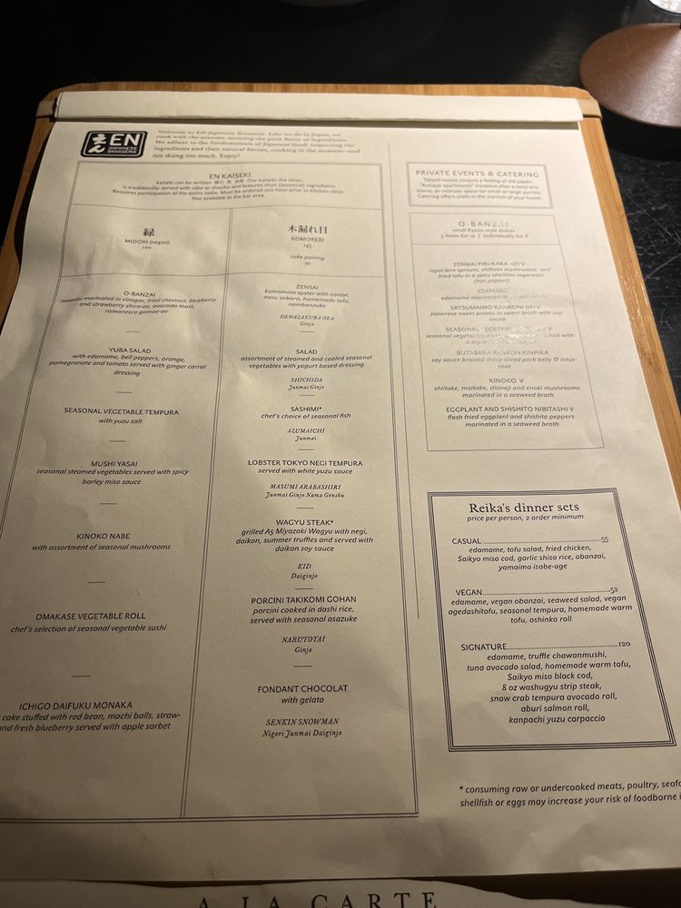 edamame, truffle chawanmushi, tuna avocado salad, mushi yasai, saikyo miso black cod, stone grilled US ribeye, snow crab tempura avocado roll, aburi salmon roll, kanpachi yuzu carpaccio